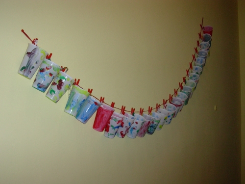 man nehme eine schnur mit 24 kluppen (gabs um 1.95 beim sewa) und 24 platik oder auch pappbecher.